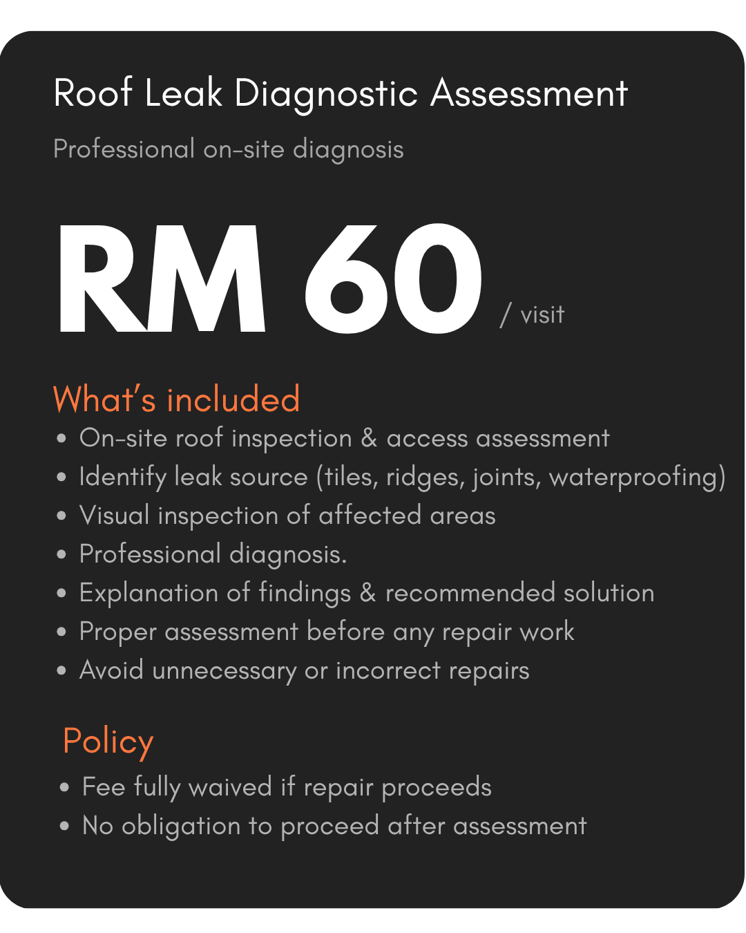 Air-cond service Choose your service planClick the package you love to get started ! Professional on-site diagnosis to identify the true source of leakage. No guesswork.Diagnose first. Repair right.Click to Book Now ! Advanced Roof Leak Diagnostic